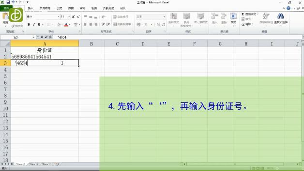 再把输入法切换到“英文状态”,然后在单元格中输入一个单引号“'”,再输入身份证号。这样就能完整正确的输入我们的身份证号了。