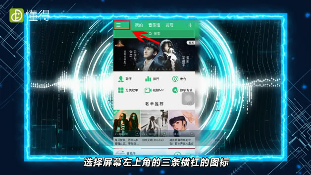 首先我们打开手机QQ音乐,选择屏幕左上角的三条横杠的图标。