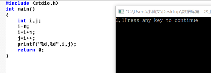 从示例种可以看出初始的i=0,i=i+1后i=1。这是我们将j=i++运行,j先等于i,i再进行i++。因此i++是先有值后自增。最终结果i=2,j=1。