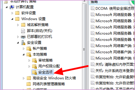 3、然后在弹出来的窗口中点击打开计算机配置\Windows 设置\安全设置\本地策略中的安全选项。