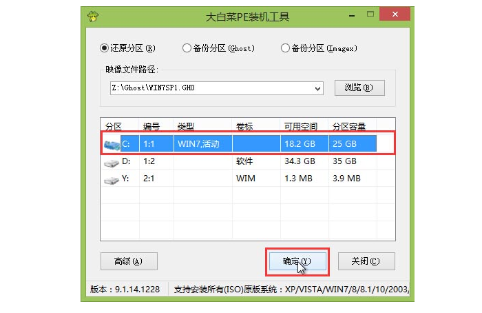 8、等待大白菜PE装机工具提取所需的系统文件后,在下方选择一个磁盘分区用于安装系统使用,然后点击“确定(Y)”进入下一步操作。如下图所示、