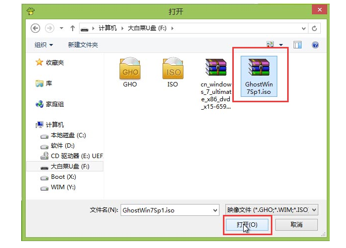 7、点击打开存放在u盘中的ghost win7系统镜像包,点击“打开(O)”后进入下一步操作。如下图所示