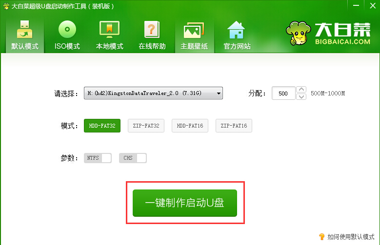 1、下载并且安装好大白菜装机版,打开安装好的大白菜装机版,插入u盘等待软件成功读取到u盘之后,点击“一键制作启动u盘”进入下一步操作。如下图所示