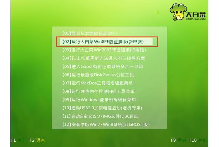 5、将制作好的大白菜u盘启动盘插入usb接口(台式用户建议将u盘插在主机机箱后置的usb接口上),然后重启电脑,出现开机画面时,通过使用启动快捷键引导u盘启动进入到大白菜主菜单界面,选择“【02】运行大白菜Win8PE防蓝屏版(新电脑)”回车确认。如下图所示