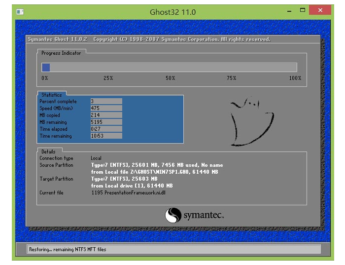 10、此时耐心等待系统文件释放至指定磁盘分区的过程结束。如下图所示