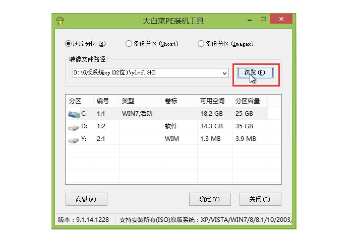 6、登录大白菜装机版pe系统桌面,系统会自动弹出大白菜PE装机工具窗口,点击“浏览(B)”进入下一步操作。如下图所示