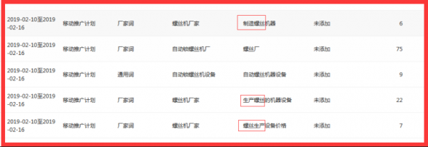 像上图一样,螺丝设备和项目无关,但是不能添加为短语否定,只能添加为精确否定,否则“自动锁螺丝机设备”、“螺丝机设备”等核心关键词就没法展现出广告来了。