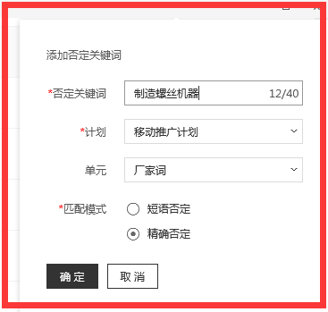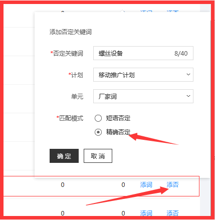 在这里,要先说明一下短语否定和精确否定的区别,短语否定便是之前的否定关键词,只要包含到短语否定添加的关键词,那么在该单元或计划便不会展现出广告。精确包含,便是需要和添加的词一样,才不会展示广告。