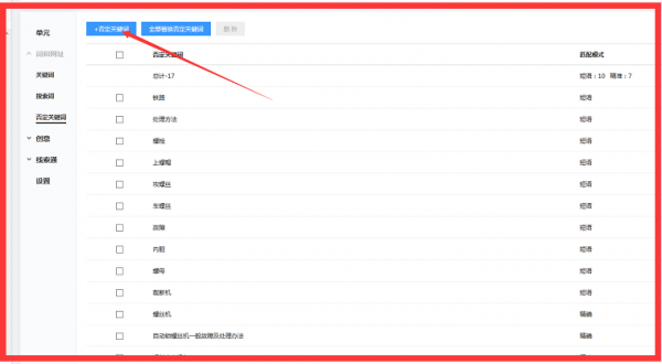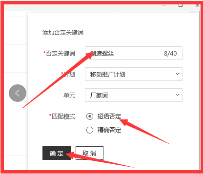 举例:自动锁螺丝机项目,跟生产、制造相关的关键词都是跟项目无关的,便可把生产、制造或者生产螺丝、制作螺丝,这两组词中任何一组添加为相应单元或者计划的短语否定词: