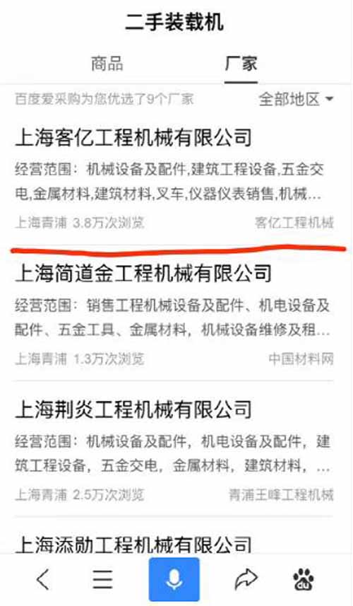 这个时候如果我们的网站也是做二手装载机的,无论是做SEO自然排名还是做SEM竞网站里核心关键词“二手装载机”排在搜索引擎首页前五(一般很难,因为几乎都是百度自家的产品)。