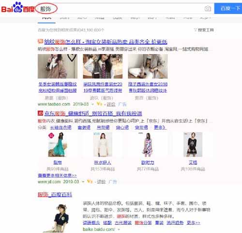 首先我在百度搜索引擎搜索框内输入“服饰”二字,然后按照日常惯例一个回车进行搜索结果,结果中显示排名第一和第二的分别是竞价位淘宝跟京东商城,请看下图