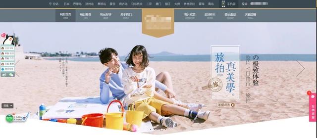比如下图。从整体来看,咨询工具常悬浮于两侧,随时都可引导用户咨询;整个页面用写真做背景,是不是更容易引发用户点击的欲望;像这些我们都可以学习。但关于导航栏的字较小,那我们在设计时就要尽量避免。