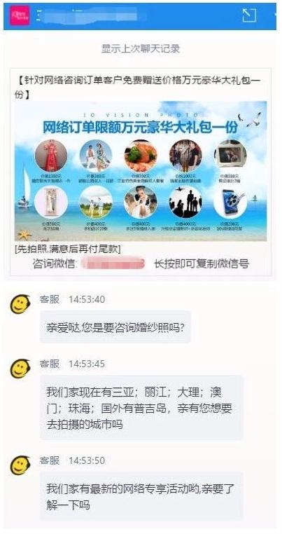 比如下图,是婚纱摄影的客服聊天截图。从图中,我们可看出最上门的那个图片很是吸引人,那我们是否也可以应用到自己的客服转化上?