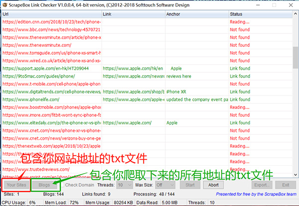 下载之后添加两个文件,在“Your Sites”中上传包含你网站地址的txt文件,然后在“Blogs”中上传包含你爬取下来的所有提及iPhone的txt文件,点击“Start”就可以读取到所有结果啦~