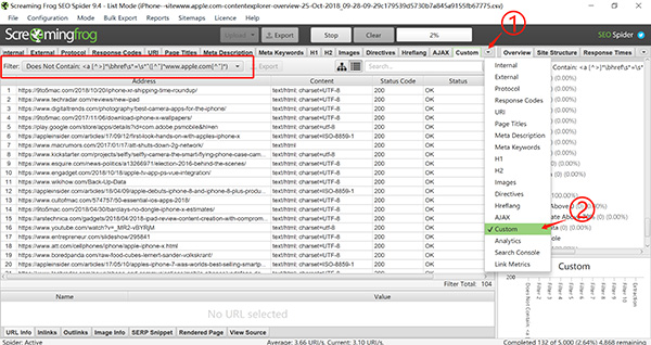 选择Screaming Frog右侧小箭头扩展菜单栏,点选Custom可以得到经过我们添加筛选命令的页面,即提到iPhone但未添加Apple官网链接的页面(具体可能需要再筛选一下)