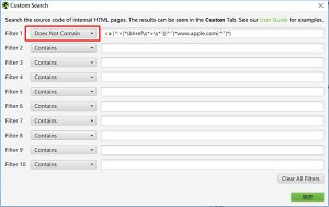 Screaming Frog > Configuration > Custom > Search ,在Filter中选择Does Not Contain,使用命令 <a [^>]*\bhref\s*=\s*”([^”]*www.apple.com[^”]*)可以筛选出不包含www.apple.com链接的页面(大家可以将www.apple.com改成自己网站的域名)。