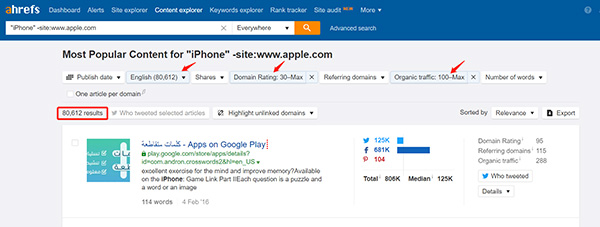 通过Ahrefs我们能找到提及iPhone的页面,但还需要进一步筛选,因为其中有一些已经添加了苹果官网的连接。
