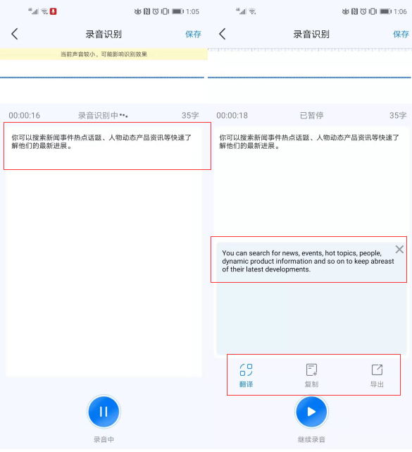 选择录音实时转写之后,进入的是录音识别的开始页面,单击底部蓝色开始键,就可以开始边录音变转换成文字内容,识别结束之后,还可以对识别完成的文字进行复制、翻译、导出等操作;
