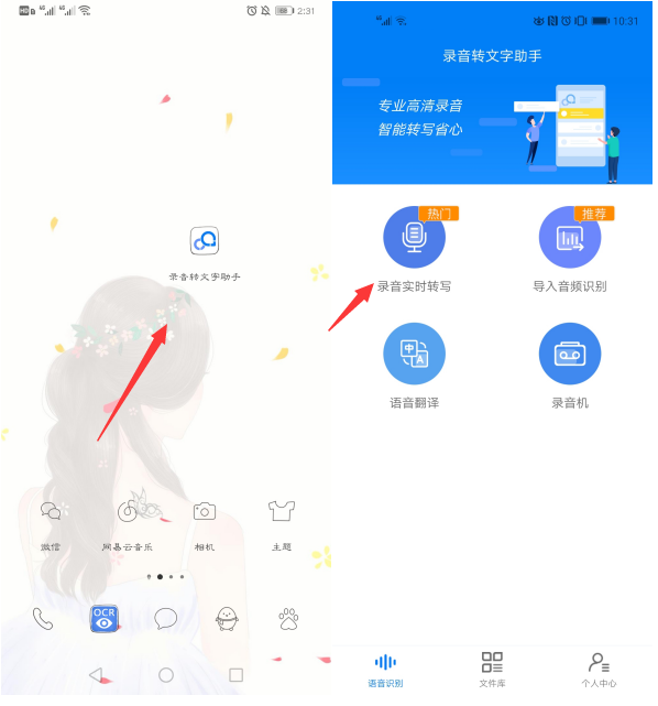 首先打开手机上已经安好的录音转文字助手,可以看到功能页上显示的4大功能:录音实时转写、导入音频识别、语音翻译以及录音机,这里我们选择录音实时转写,说一下:会议录音如何转文字;