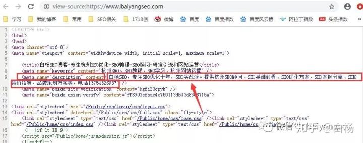 (截图白杨SEO博客首页,用crtl+u可以快速查看当前网页源代码)