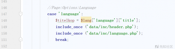 我们直击漏洞根源,查看代码在uplpod.php文件里,可以看到有个lang变量给了language.php,并附加条件,设置的指定文件都存在,才可以将参数值传递过去,代码截图如下: