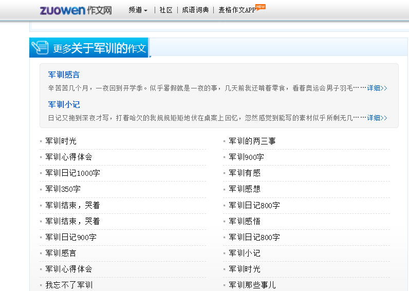 1个高质量的链接可以敌的过3个不相关的链接。例如,你这个网页都是讲的军训作文,而他的相关文章都是有关于军训作文的。提高用户的访问深度的同时,也提高了网站权重的全局导向。内容的相关程度在某些时候只能靠外链建设人员的常识和直觉来判断。如图: