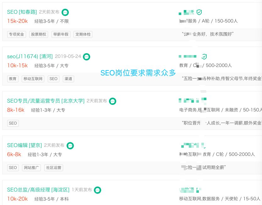 关于seo是什么职业,可以通过网上招聘网站了解到大量的招聘需求和岗位要求,你可以来 拉钩网 BOSS直聘 查看SEO具体的职业岗位。可以看到招聘SEO类的人才需求非常多,岗位不同薪水待遇也不同,一般SEO的岗位薪水在 4K~8K(基本SEO岗位),10K~20K(高级管理级SEO岗位)之间不等。