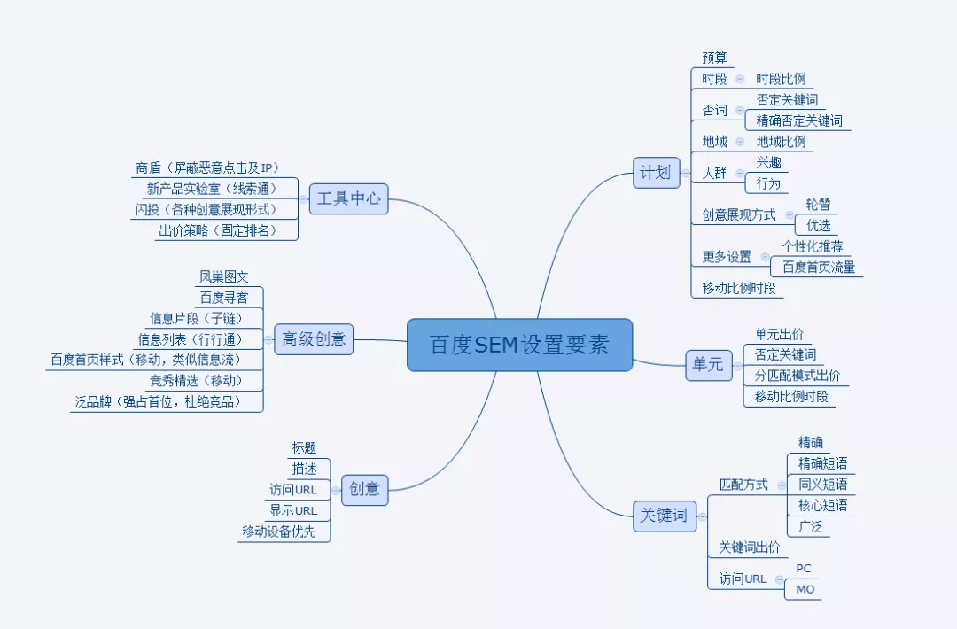 任何的SEM账户基本都由计划、单元、关键词、创意构成,然后辅助高级创意样式,丰富展现形式,提高曝光和点击,其中各个模块设置重点如图所示。
