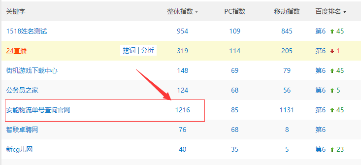 通过分析他们的关键词库,可以发现有很多非SEO相关的关键词,但都是一些搜索指数很高的关键词。例如:安能物流单号查询官网,这个关键词的搜索指数是1216,如图: