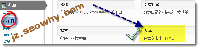 选择外观-小工具-文本,把文本小工具拖拽到你希望的位置然后松手,关于小工具的使用可以参考教程:wordpress外观-小工具使用。