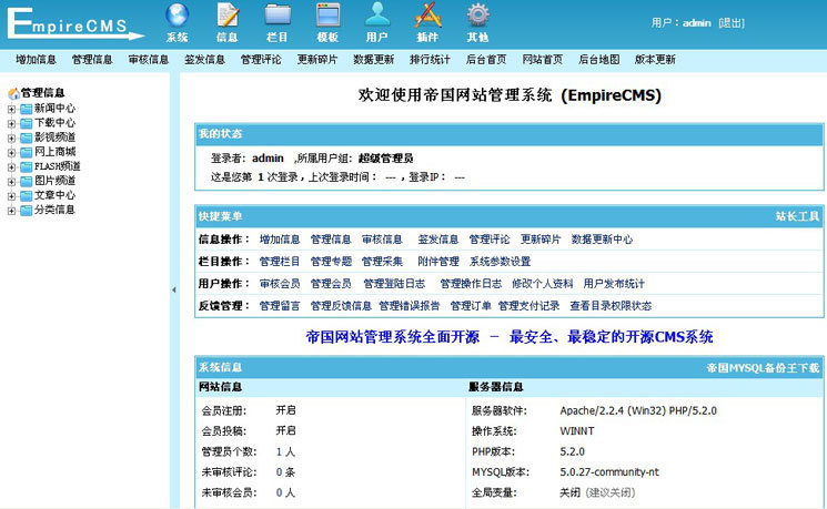 EmpireCMS 系统是一套采用PHP + MySQL数据库方式运行的开放源代码软件程序,所需要的环境是:PHP,MySQL数据库,环境所需要的程序均为免费。