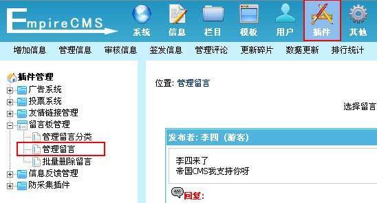 1、登录后台,单击“插件”菜单,选择“管理留言”子菜单,进入管理留言界面: