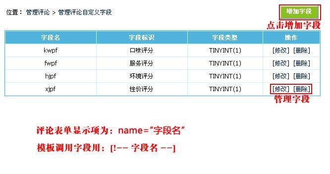 | [自定义评论字段]按钮 | 除了默认的评论内容字段外,用户还可以自己增加评论发布项。对发布项进行管理。 |