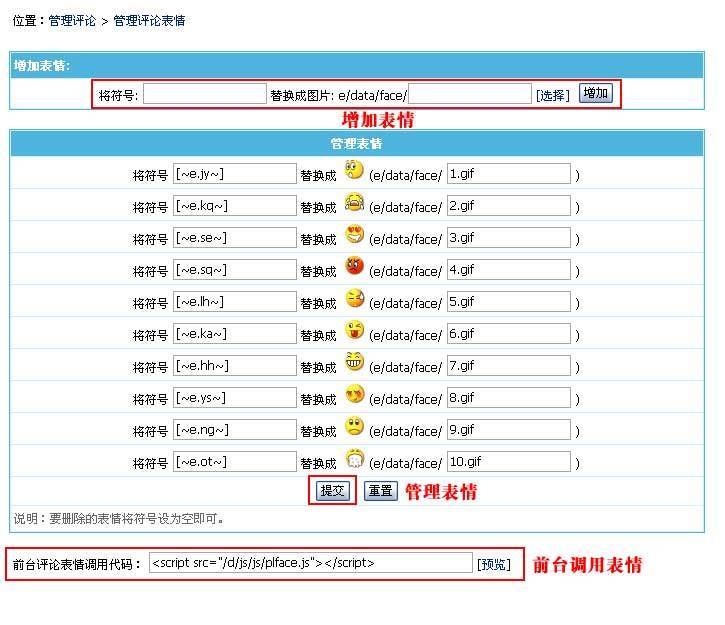 | 前台评论表情调用代码 | 在要显示表情位置的评论表单里加:<script src=”/d/js/js/plface.js”></script> |