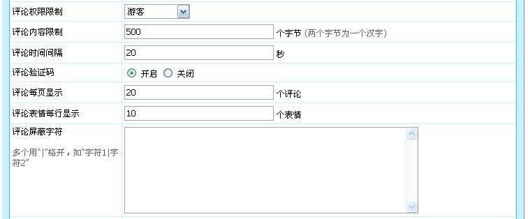 | 评论屏蔽字符 | 设置评论屏蔽字符。多个用“|”隔开,如“字符1|字符2”。 |