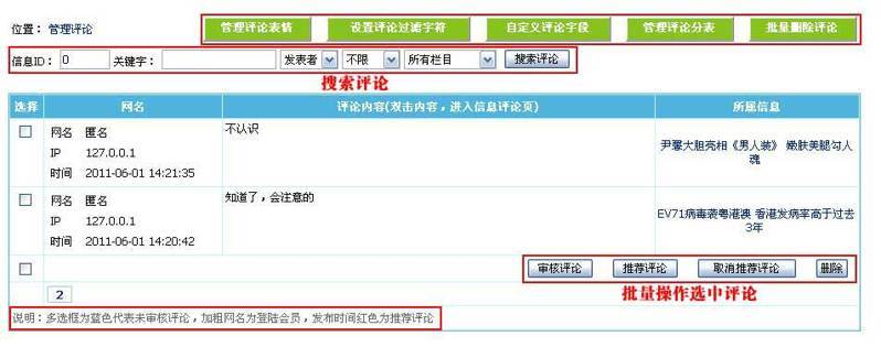 | [搜索评论] | 按栏目、审核、关键字等进行评论搜索。 |
