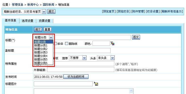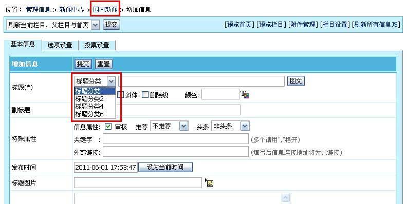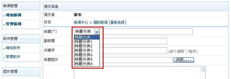 5、增加标题分类后,增加/修改信息页面就可以选择我们增加的标题分类,如下图:
