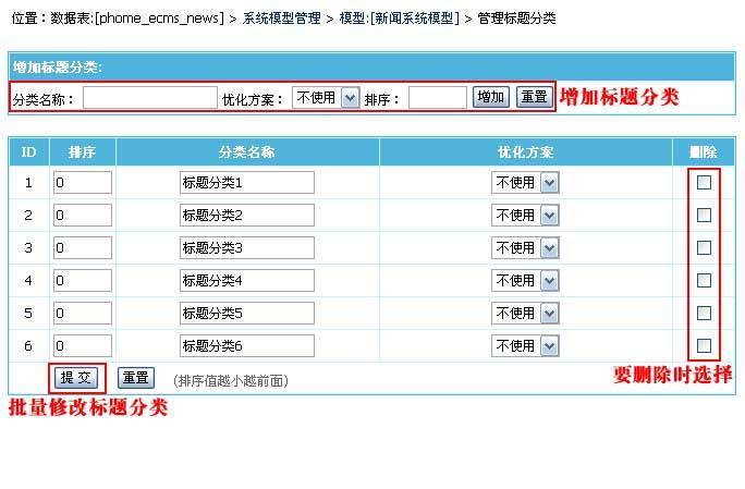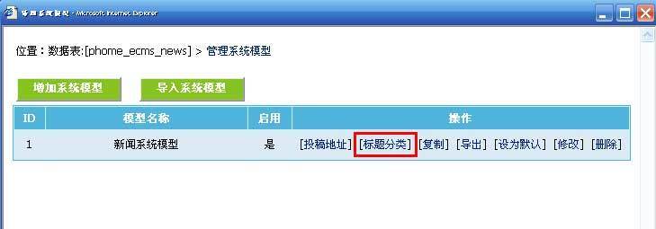 4、从管理系统模型页面,点击“[标题分类]”,进入标题分类管理: