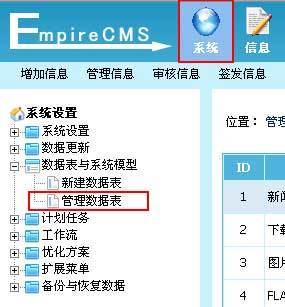 1、登录后台,单击“系统”菜单,选择“管理数据表”子菜单,进入管理数据表界面: