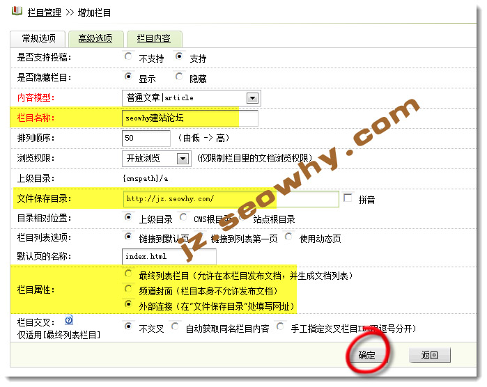 栏目名称,填写你的外部链接名称;文件保存目录,填写你的外部网站地址;栏目属性,选择外部链接,然后选择下面的