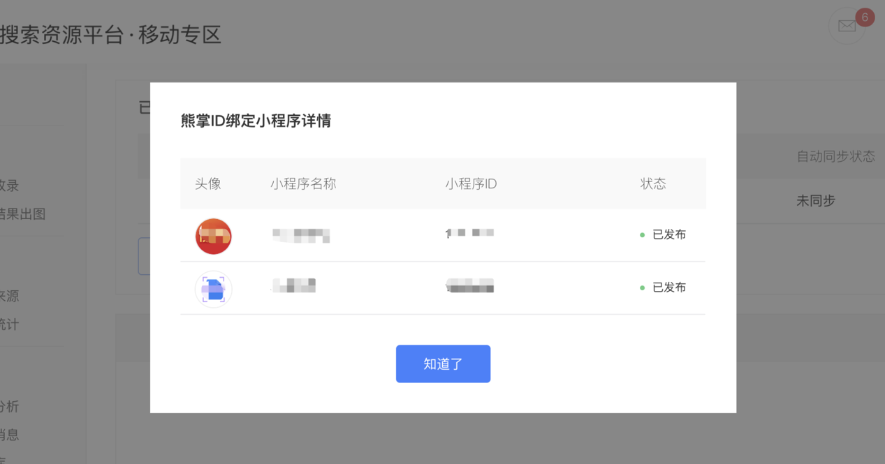 2.点击【绑定详情】,可看到当前熊掌ID绑定的所有小程序(需为“已发布”状态):