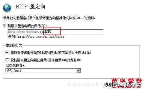 3、IIS7主机windows系统设置方法 打开服务器iis信息管理器选中需要重定向的网站,双击右侧界面的HTTP重定向,勾选将请求永久重定向到此目标并输入跳转域名。勾选将所有请求重定向到确切目标(而不是相对目标),下拉选择(永久301),右侧菜单栏选择应用。