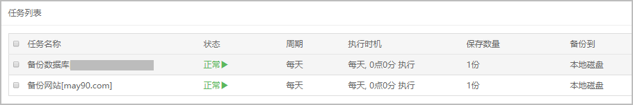 执行周期按照自己的需求选择,如果你网站每天都有更新内容,最好选择每天都备份,时间一般选择凌晨访问量比较少的时候最佳。添加任务计划完成后可以在下方的任务列表中查看。