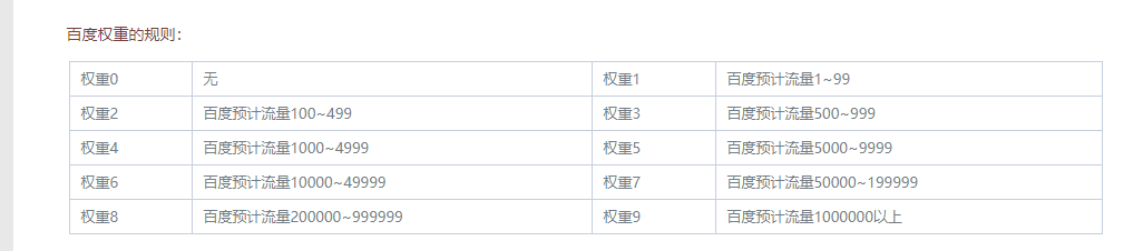 权重的等级是从1~9,chinaz站长东西给出的核算公式是经过预估流量到达多少而定,例如你的预估流量是100那么网站权重便是2,低于100的则是1。