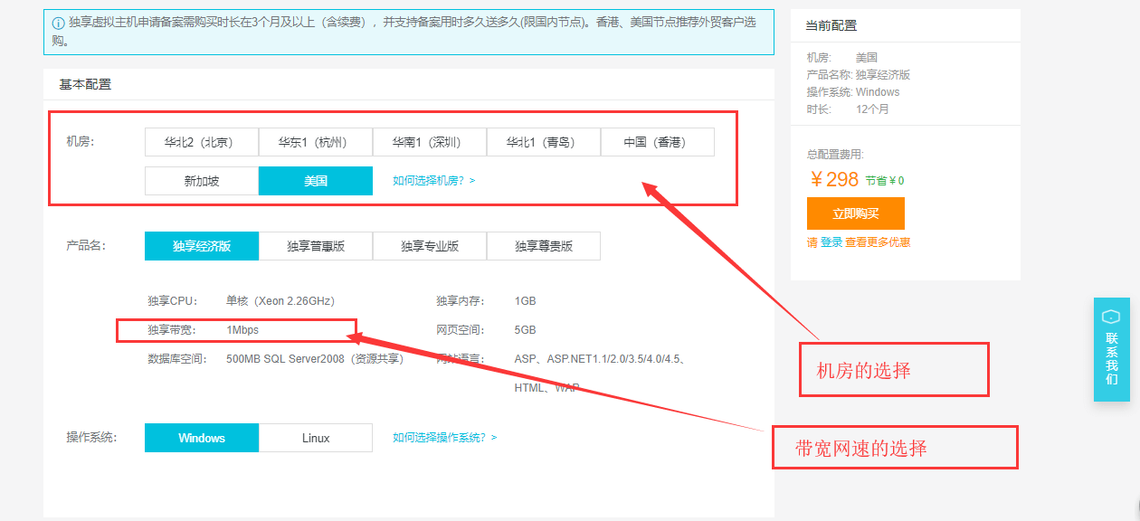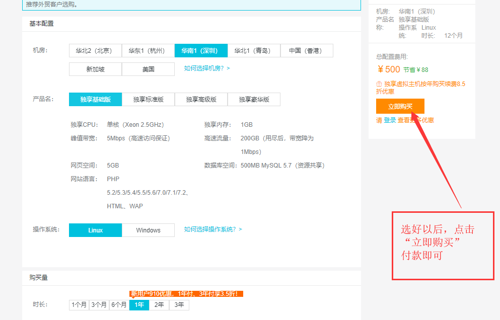 2.2、选择自己想要的主机配置,点击“立即购买”