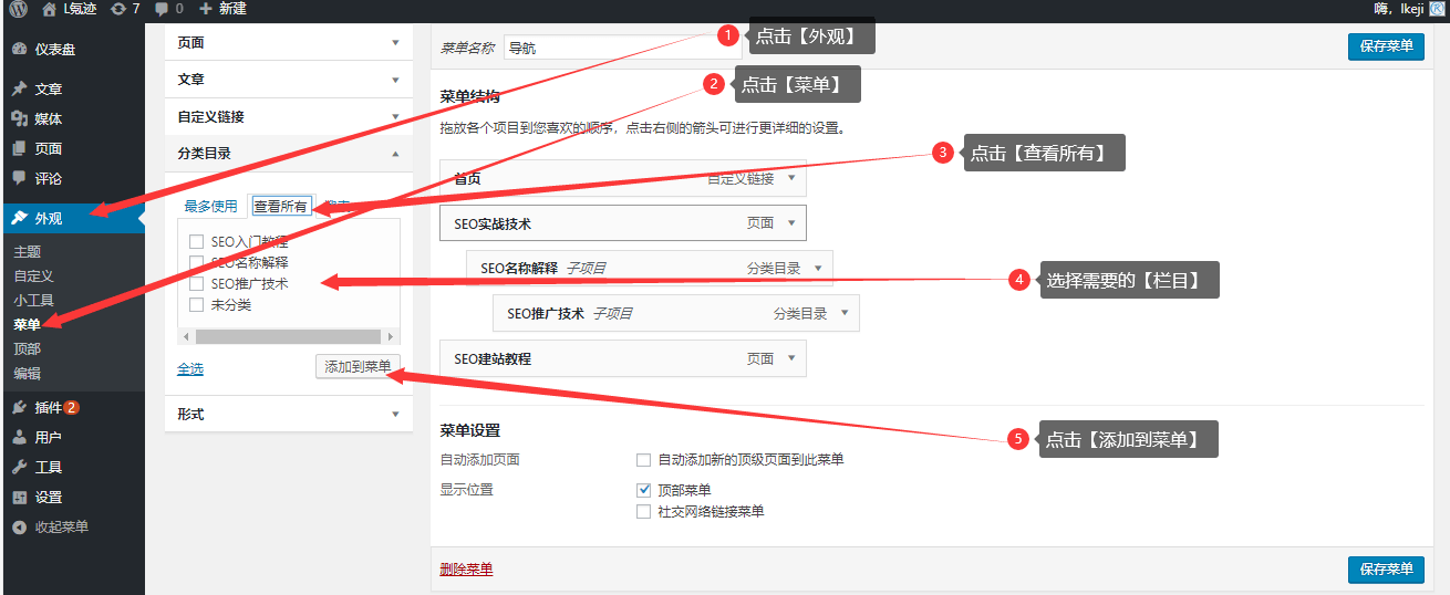 3、点击【外观】,点击【菜单】,点击【分类目录】,点击【查看所有】,选择你想要得分类目录,点击【添加到菜单】,操作教程如下图: