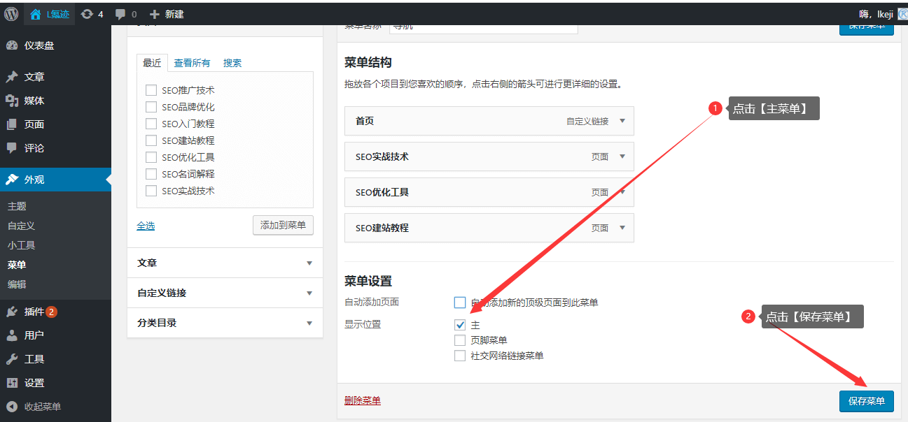 2、重复第一个步骤,设置好你所需要的导航栏目,然后点击【外观】,点击【菜单】,输入【菜单名称】,点击【创建菜单】,操作教程如下图: