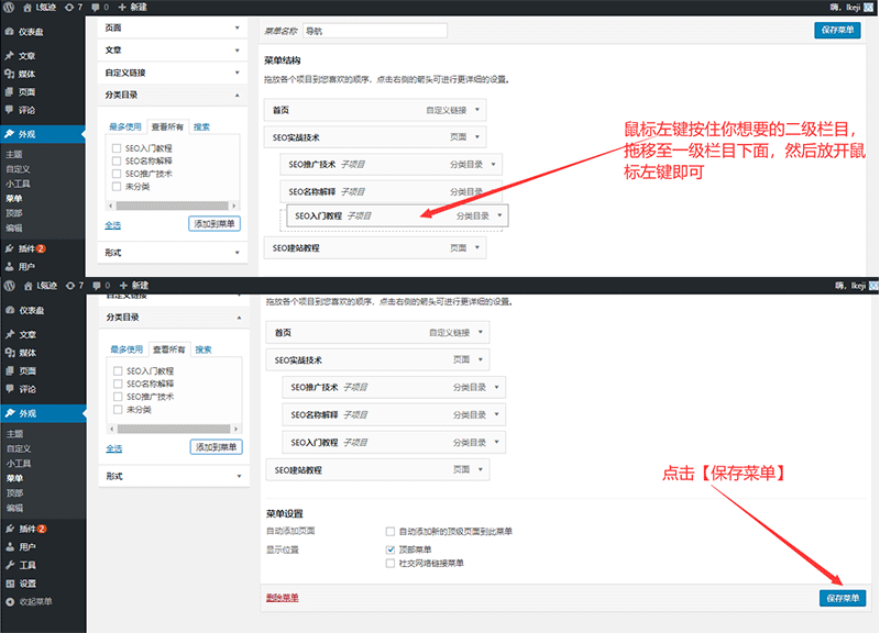 【注:三级或者多级菜单也是同样的操作教程,把三级菜单栏目拖移至二级菜单栏目下面即可,以此类推】