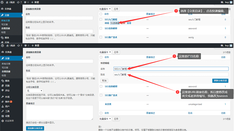 2、选择分类目录,点击【快速编辑】,修改【别名】(即URL链接名称)为英文或者拼音缩写,不要用中文,操作教程如下图: