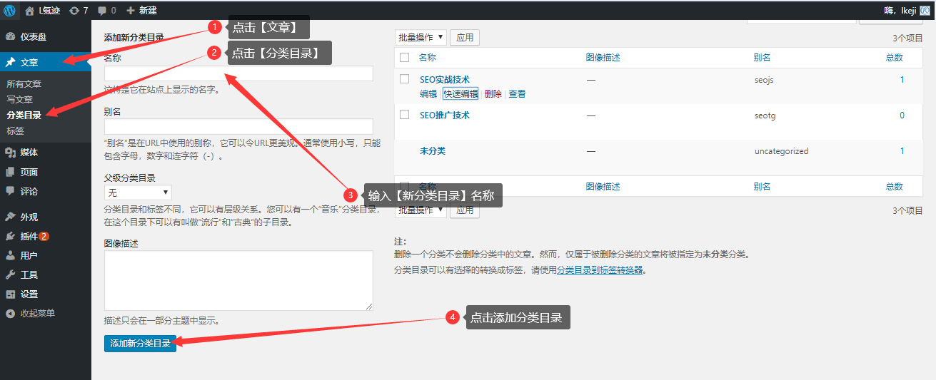 1、点击【文章】,点击【分类目录】,输入【新分类目录】名称,点击【添加新分类目录】,创建自己所需要得分类目录专栏,操作教程如下图: